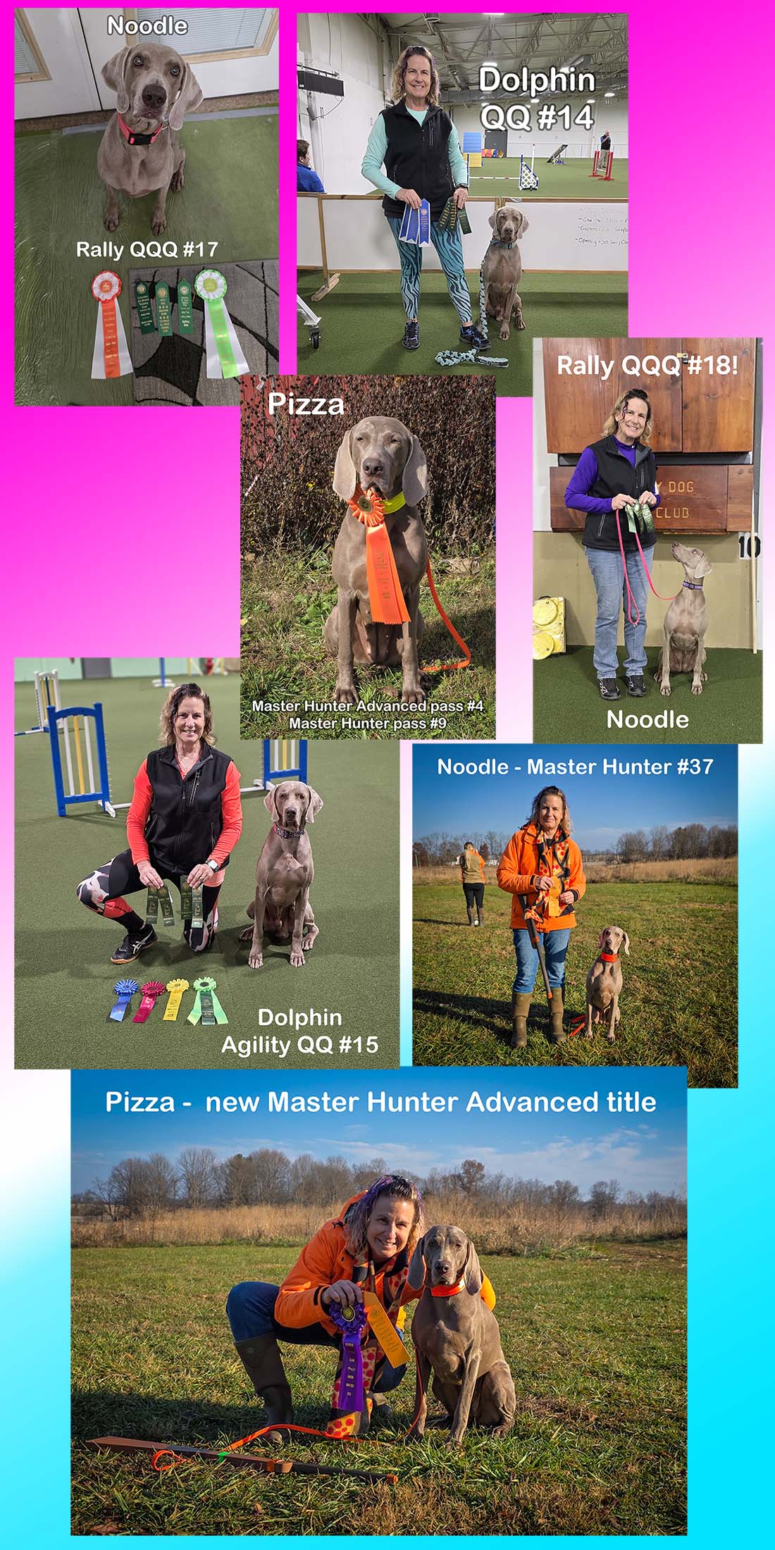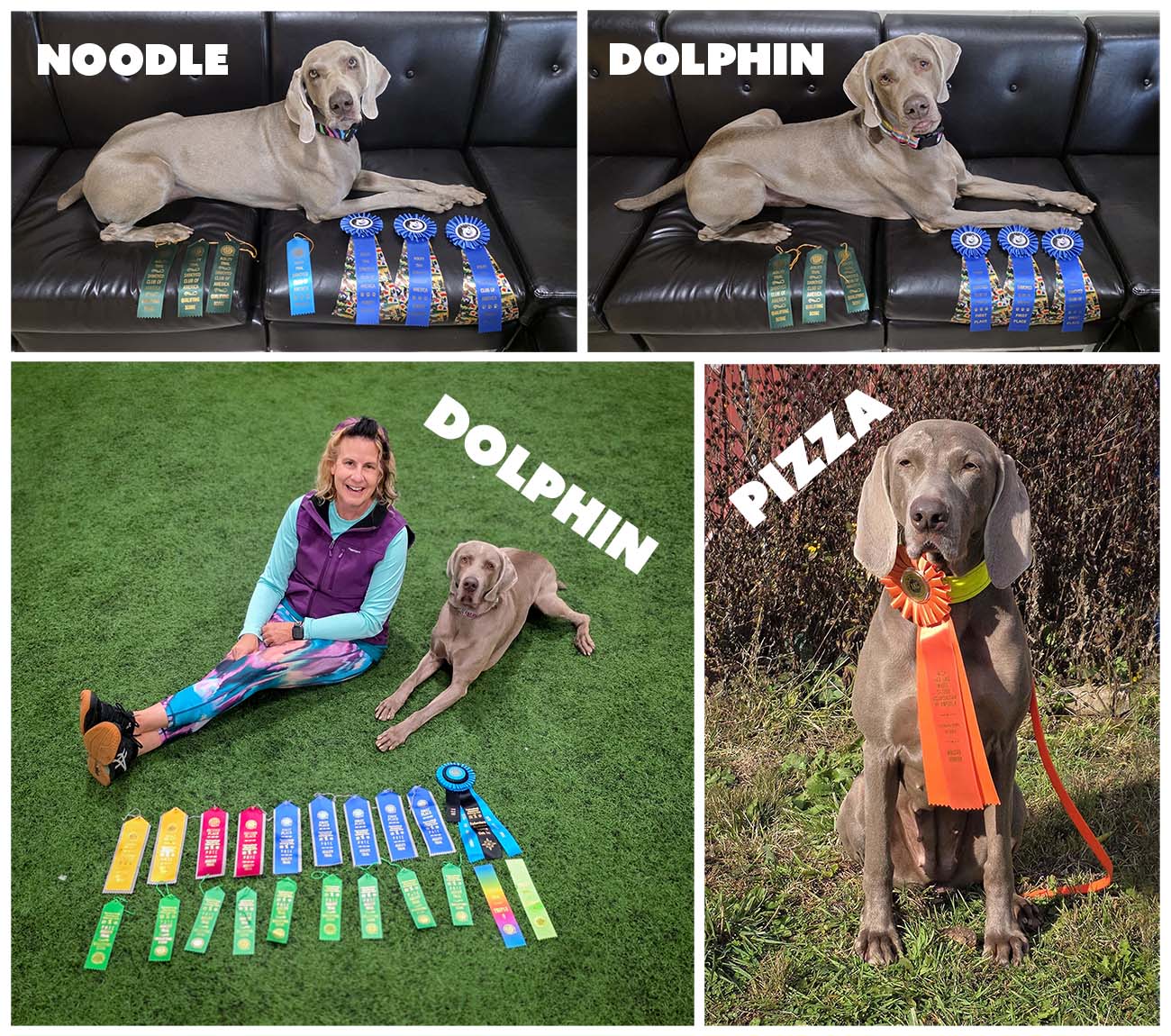 October was a great month for the Weim Trio! Noodle earned a Triple QQQ at a one-day agility trial. Dolphin was one Q short of a quadruple QQQQ at that same trial, but then came back a week later and earned a full Quadruple QQQQ on one day, and a Double QQ the second day towards his MACH (with many great class wins!). Noodle also earned her Master Bronze Agility Preferred title, and Dolphin earned his Tine 2 Beat 3 title. Though technically it was November 2nd, we will count Pizza's accolade in October as she earned wonderful scores of straight 9's in Master Hunter to earn her Master Hunter Advanced pass #4!